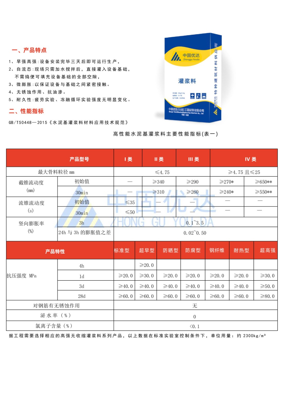 早强、高强、抗离析、绿色环保、微膨胀性、自流性好、粘结度高、耐久性强、抗开裂等