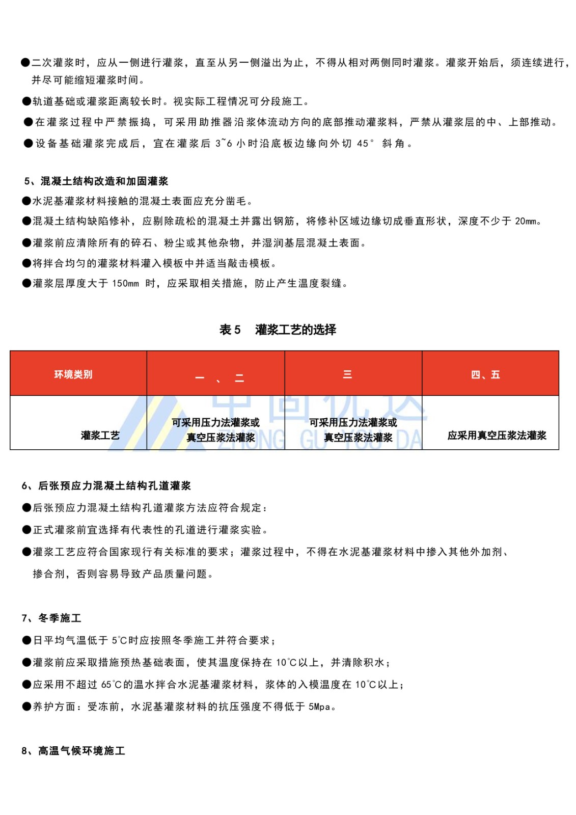 5、灌浆后至脱模前,应避免碰撞到灌浆部位和设施,以免损坏未结硬的灌浆层;
