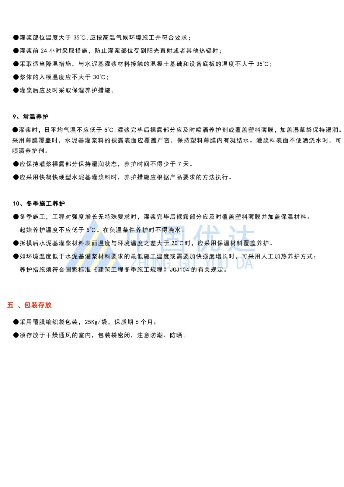 7、高强无收缩灌浆料不能与普通水泥混用,不能掺入外加剂。